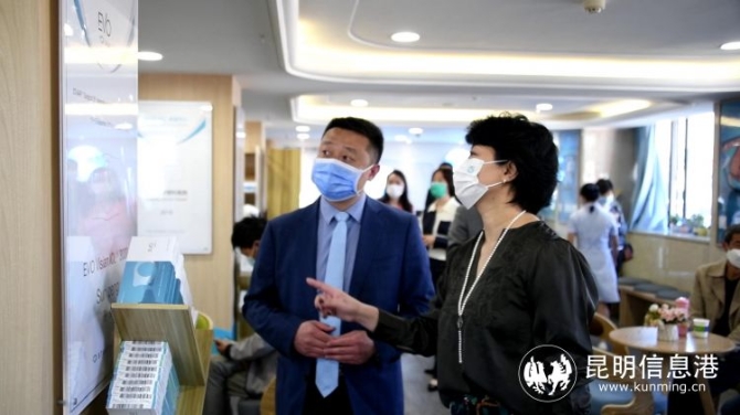 图为:昆明爱尔眼科医院副院长孙鹏陪同付奇志参观“全球ICL卓越中心”