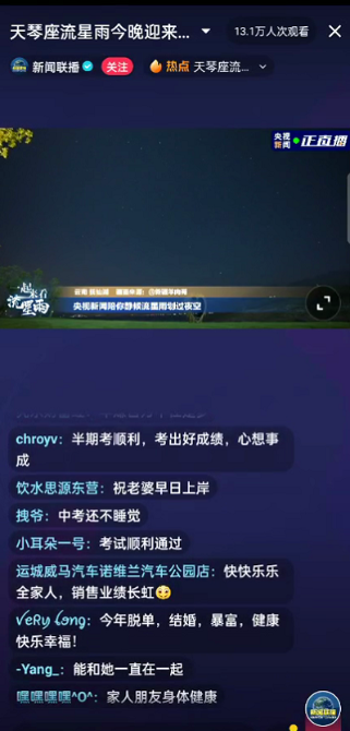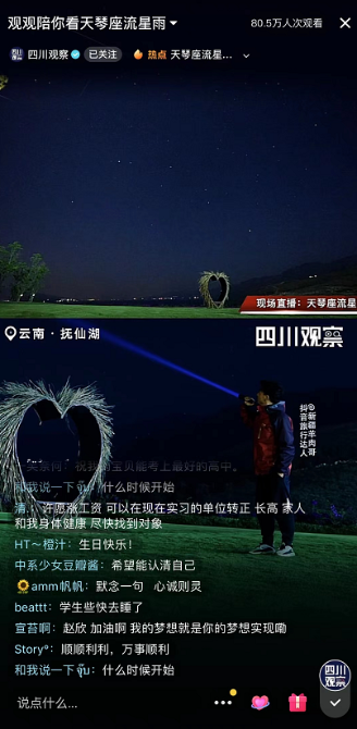 拥有千万粉丝的四川观察、新闻联播等官方媒体同步在线上转播了这场在云南抚仙湖星空小镇崖顶公园上空的流星雨,直播累计观看人次超过百万人次。