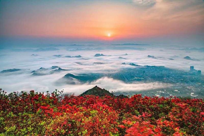 海拔近1500米、有着“万亩杜鹃”之称的丹寨龙泉山,毗邻贵州省黔东南州丹寨县城,从山腰至山顶长满了野生的红杜鹃,这里的花海曾获央视《新闻联播》点赞并在抖音播放超1.4亿次,成为全国各大杜鹃花海中的网红,每年吸引上百万的游客前来观赏。“四面清风皆入画,一片闲云独看花”,置身花的海洋,人们晨起可登顶观云海杜鹃日出磅礴,傍晚可俯瞰赏日落彩霞漫山红遍。