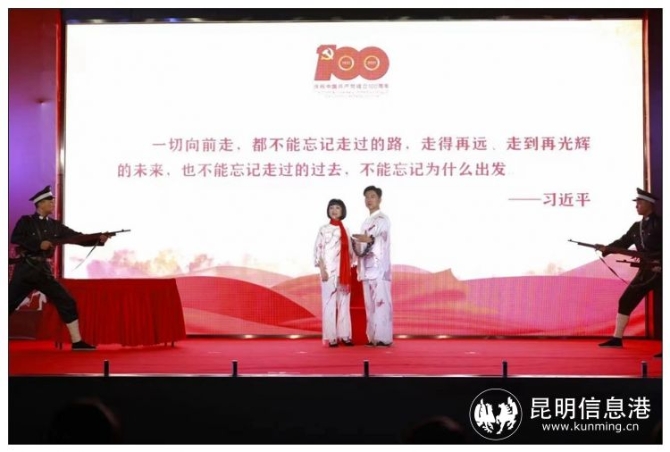 群众永远跟党走,党和人民心连心。在一首重焕青春的大合唱《送红军》把活动推向了高潮。作为当晚活动的最大亮点,盘龙区还为广大市民群众带来创新党课昆明曲剧《云岭丰碑 赤血英侣》精彩上演。该剧由曲剧团杨建昆、吴冠霖主创,戴明、金燕等主演,以昆明本土曲剧的方式展演。现场演绎中共云南早期地下党杰出领导者李国柱、吴澄夫妇被国民党反动派逮捕后,不为亲情所动,不为富贵所淫,不为酷刑所屈的共产党员大无畏革命气概和高尚情操。当演到李国柱、吴澄这对革命伉俪慷慨就义,身怀六甲的吴澄把对党的忠诚、对爱人的忠贞饱含在一缕青丝和一块用鲜血染成的手绢上,赠予爱人李国柱时,“凭我们不平之血的飞溅,把全世界来涂染遍”的革命誓言响起,将演出推向了高潮。