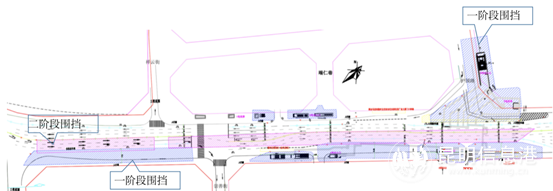 为方便沿线群众出行,充分利用地下空间缓解城市交通拥堵,地铁项目一般沿城市主干道路敷设,车站、出入口一般设置在人流量较为集中的主干道或交叉路口,为确保在施工安全和道路通行,建设期间必须占用部分道路围挡施工。地铁车站需分多期围挡开展建设,正常情况下,一般标准车站需分六期围挡,特殊情况将多达八期以上,如西昌路站围挡将分十二期开展。标准车站一期围挡开展施工范围内地上、地下管线迁改,二、三期围挡根据道路现状分半幅开展道路盖板施工、主体结构施工,四、五期围挡分别开展道路两侧附属结构施工,六期围挡实施管线回迁和道路恢复。