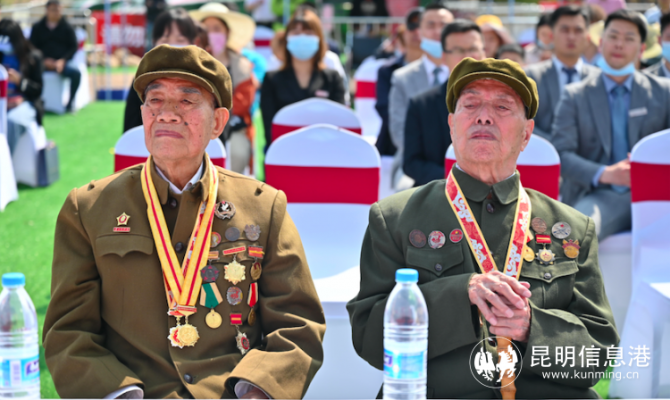 云南保利实业有限公司总经理谢光杰和老兵影视博物馆馆长刘辉为现场的刘清选和梁仁旺两位老兵颁发了保利发展爱国主义教育·国防兵器展纪念章,以崇高的敬意致敬永远的英雄。