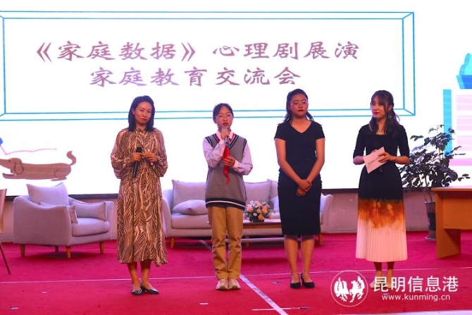 昆一中西山学校学生成长生涯规划中心教师通过学生自演心理剧的方式,帮助孩子表达自己的心声,让家长听听孩子们的想法和需求。当天,来自昆一中西山学校初一年级的家长们到校观看了初一年级学生自排自演的心理剧《家庭数据》,结合心理剧中的家庭教育现状,家长们与心理老师共同交流青春期孩子的家庭教育问题。