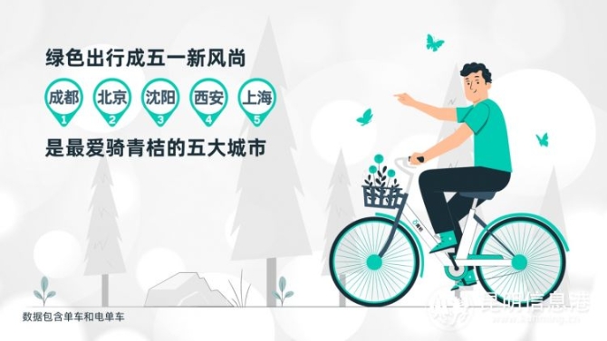 绿色出行成为五一新风尚,成都、北京、沈阳、西安和上海是最爱骑青桔的五大城市。随着气温上升,青桔夜间骑行量也逐步增加,18点至20点,是“五一”青桔骑行高峰时段。