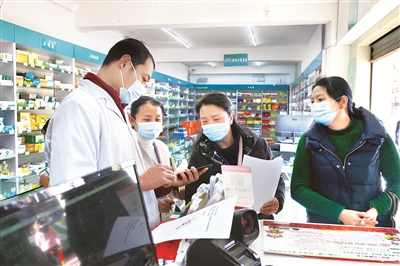 云南省曲靖市马龙区纪委监委深入各医疗卫生服务机构、零售药店,督促相关部门落实整治医疗领域不正之风主体责任。图为该区纪检监察干部走访药店。方俊/摄