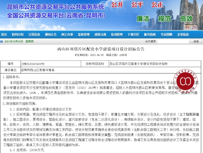 记者日前从昆明市投资促进局获悉,西山区教育体育局4月25日发布西山区双塔片区配套小学建设项目设计招标公告,拟总投资1.3亿元于该片区配建小学。计划开始时间为2021年6月1日。