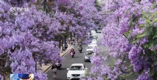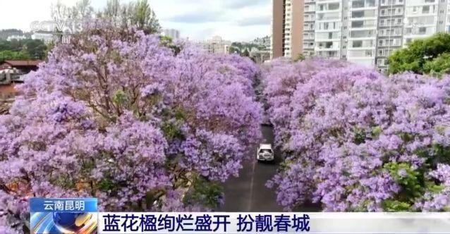 这几天,在云南昆明城区,多条道路上的蓝花楹绚烂盛开,蓝紫色的花海美不胜收,成为了春城里一道亮丽的风景线。