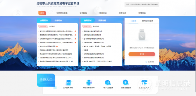 昆明市公共资源交易电子监管平台为全市各级交易监管职能部门开放监管端口,提供监管渠道。同时顺应交易平台市场化、社会化新形势,监管平台对外提供数据标准接口,允许符合标准的第三方交易平台接入,扩大监管范围,满足交易市场化形势下的监管需求,防范滋生交易腐败乱象。