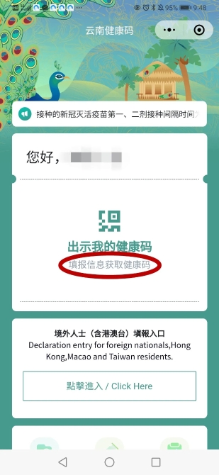 点击“云南健康码”,进入首页,点击“填报信息获取健康码”