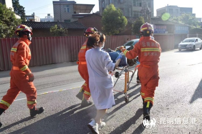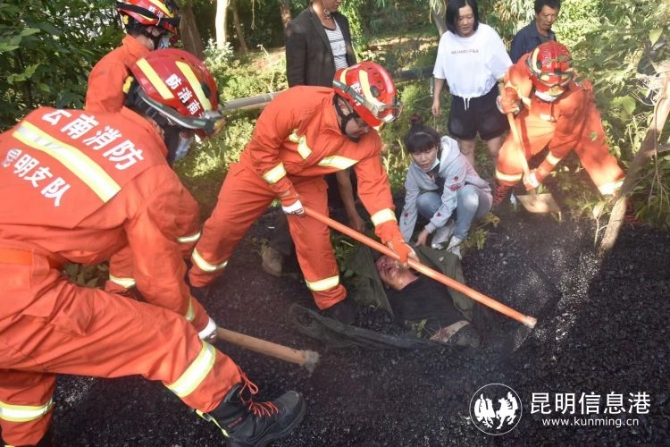 当日7时34分,富民县消防救援大队立即出动1车7人赶赴现场救援。7时39分,救援人员赶到现场,发现一辆大货车侧翻在公路边,转载的沥青洒落一地,一名男子头部以下全被沥青埋住,周边村民正拿着铁楸、锄头等工具抛挖,救援人员立即接过村民们手中的工具实施救援。
