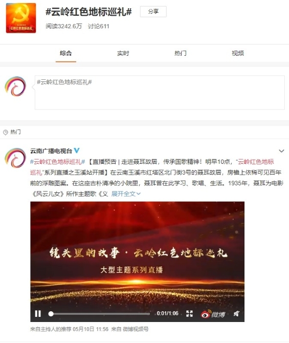 截至目前,本场直播观看量过145万,单场直播阅读量1407万,总阅读量3407万。其中,“云岭红色地标巡礼”微博话题阅读量3242.6万,@云南日报、@云南网、@北京电视台、@云南信息报、@6686体育、@昆明日报掌上春城、@保山日报、@都市现场、@中国网政视频等媒体,以及中共云南省委政法委员会@云南政法、昆明市防震减灾局@昆明防震、昆明市五华区委区政府@昆明五华发布、@昆明市五华区总工会官微、开远市融媒体中心官方微博@美丽开远、昆明市西山区政府官方微博@昆明市西山区发布等媒体和机构积极参与话题互动讨论。