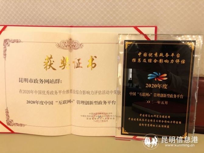 昆明市政务网站群获得2020年度中国“互联网+”管理创新型政务平台