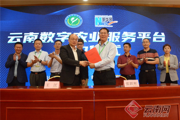 发布会上,云南省农业科学院与新华网股份有限公司签订合作框架协议,“云南数字农业服务平台”正式揭牌。(云南网记者 张成)