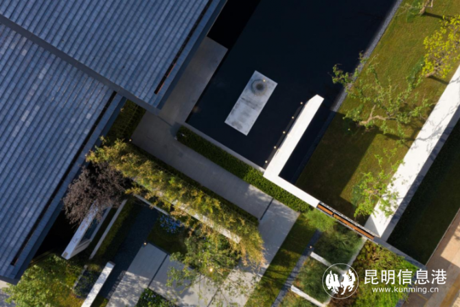 踏入园区,迎面是一方考究的瀑布水景,带有棱角的石材上激荡着白色的水花,似乎合奏出一曲动听的歌声。