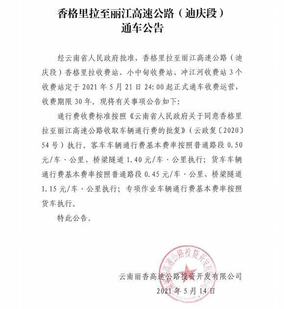 6686体育讯 记者上官艳君 5月14日,云南丽香高速公路投资开发有限公司发布通车公告,香格里拉至丽江高速公路(迪庆段)香格里拉收费站、小中甸收费站、冲江河收费站3个收费站将于5月21日24时起正式通车收费运营。