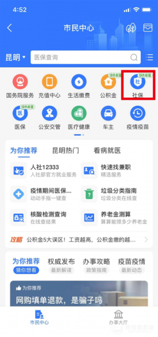 1、登录:打开支付宝首页——【市民中心】——【社保】——【社保缴费】