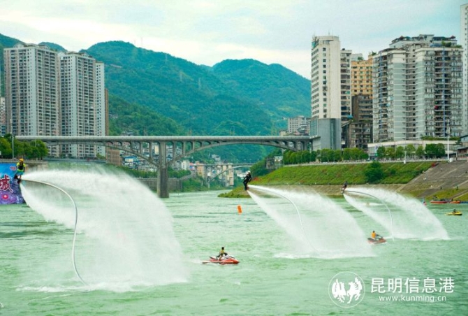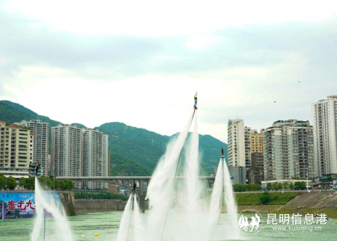 轰鸣的马达、激荡的浪花、风驰电掣的速度。观众被摩托艇竞速表演秀所吸引…水上飞人表演引来了观众的尖叫,只见他们脚踩助推器,在水面上上升、旋转、翻跟头,这极具观赏的表演引得观众们从座位上站起来,为他们鼓掌喝彩。