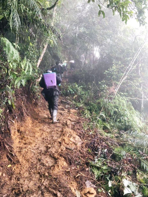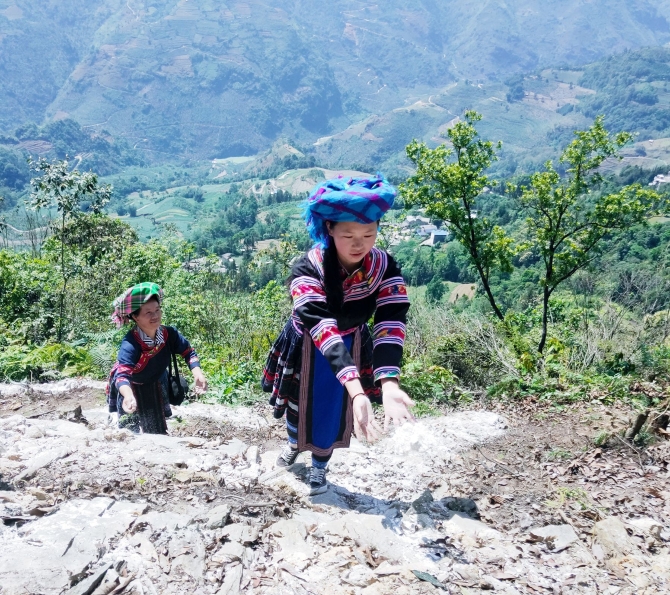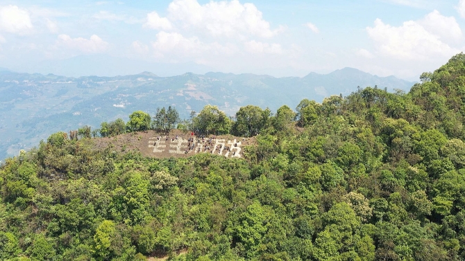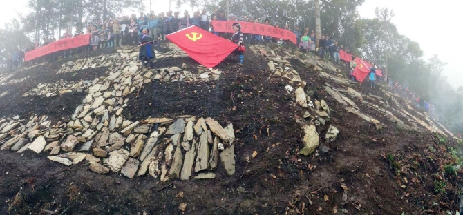 2020年10月1日,村民到山上举行护国宣誓时,从山脚背白泥到山上修复大字。