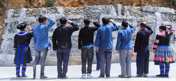 几个村民聚在一起讨论了几宿,最终确定,70年前先辈们在趾男山砌“毛主席万岁”谢党恩,现在他们也要像先辈一样用石头把感恩砌在墙上,让子子孙孙永远记住共产党、永远感谢共产党、永远跟着共产党走。于是村民自发组织起来,一家出一个壮劳力,自带伙食自带工具,在村口路边砌了一面石墙,并在墙上镶嵌了“共产党万岁”几个大字,还在路边用茅草、树干建起了一个风雨亭,方便大家停歇瞻仰。