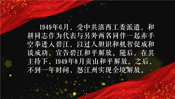 组织决定,必须选派更能贴近当地人的同志前往,谈判才能有转机。因为是傈僳族,和耕成了理想的人选。6月,二支队选派和耕、张维舟为代表,再次赴碧江谈判。期间,基于和耕的傈僳族身份,他以汉语、傈僳语双语同对方交涉,对民族头人、乡长、保长等地方人士,用傈僳语宣讲党的理念与政策,消除了隔阂,拉近了彼此的距离。最终,谈判成功,碧江宣告和平解放。