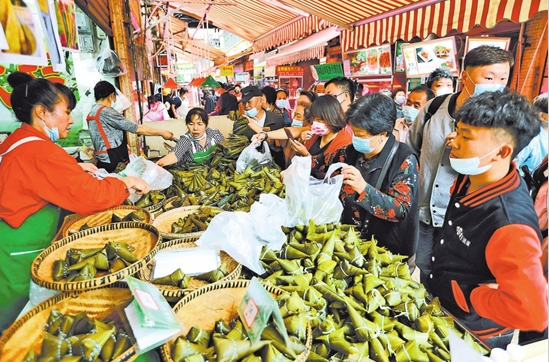 昆明篆新农贸市场粽子热销。西双版纳香米粽、布依迷你香粽、老昆明清水粽……各具特色的粽子受到消费者欢迎。记者 陈飞 摄