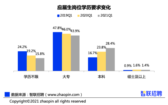 报告揭示,学历依然是企业筛选人才的重要指标,企业招聘应届生的学历门槛逐年提高,要求本科及以上学历的职位数占比,已从2019年第一季度的17.6%,上升至2021年第一季度的29.8%。学历越高,选择单位就业的比例越高,硕士生毕业后“单位就业”的占比达到72.1%,远高于本科与专科学历人才。