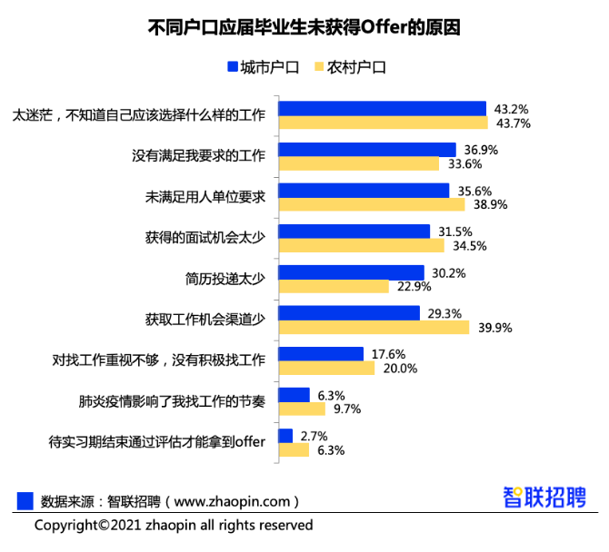 针对没有获得Offer的原因,43.6%的应届毕业生归因于自身太迷茫,不知道选择什么工作。因“没有满足我要求的工作”“简历投递太少”等主观原因而延长求职周期的城市户口毕业生占比更高,而“获取工作机会渠道少(39.9%)”“未满足用人单位要求(38.9%)”“获得面试机会太少(34.5%)”等,则让农村户口毕业生处于求职被动一方。