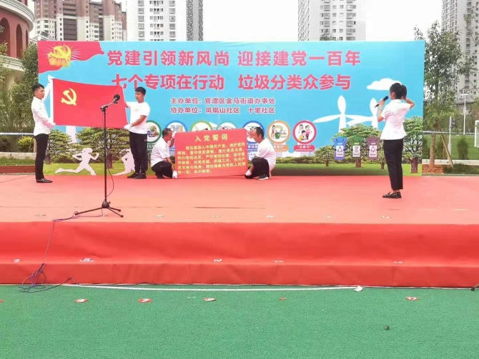 6686体育 记者郭成明 6月18日,官渡区金马街道凤凰山社区组织开展“党建引领新风尚,迎接建党一百年”主题活动,以庆祝建党一百周年为契机,积极响应垃圾分类和爱国卫生“7个专项”行动号召,充分发挥党员先锋模范作用,提高辖区居民的环保意识,让更多的人参与到垃圾分类工作中来。