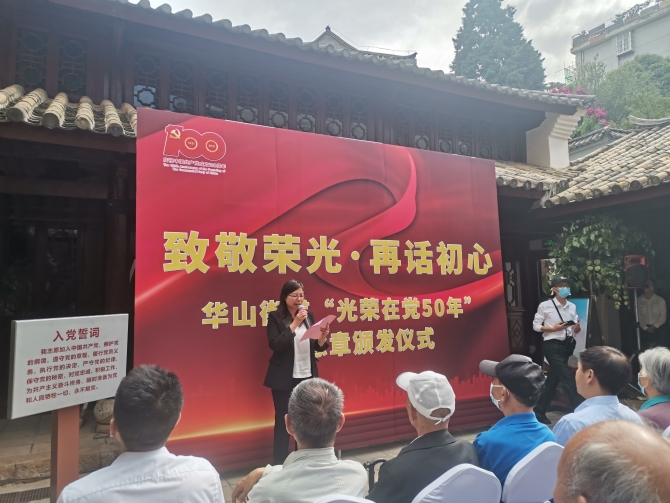 五华区区委常委、统战部部长李正兴出席,华山街道党工委书记主持,辖区32位获颁纪念章老党员代表、街道班子成员及辖区8个社区的书记、主任参加了仪式。