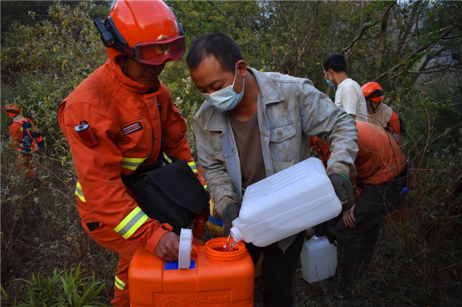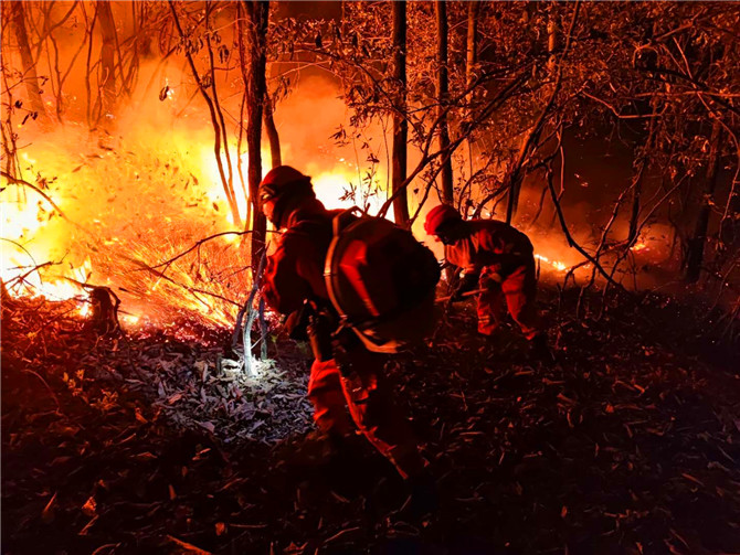 今年3月29日,禄劝县茂山镇丽山村、至租村相续发生森林火灾,情况紧急。昆明森林消防支队昆明大队接到上级命令后,大队长任海洋、教导员邢智鑫带领五华、石林、禄劝中队共90名指战员前往扑救。灭火战斗进行到第二天的时候,火场风力逐渐增强,并伴有7级以上强风,无法直接扑打,火场北侧有至租村320余名村民和黄杉树等重点目标直接受到威胁。