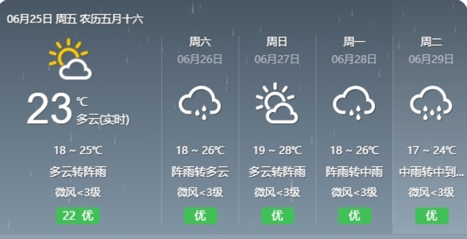 6月30日:中雨转小雨,17~23℃,偏北风2~3级。