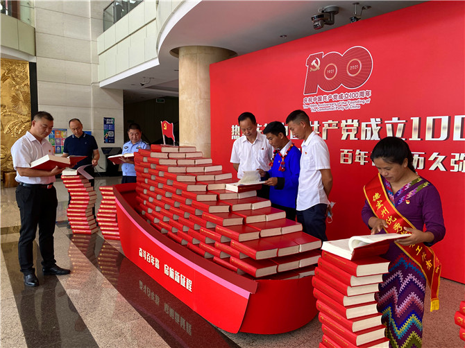 6月26日上午,中国共产党成立100周年德宏州“两优一先”表彰大会在芒市会堂举行,会堂外以浙江嘉兴南湖“红船”作为摆台造型,船身镶嵌“奋斗百年路,启航新征程”字样,船舱则用300本中共德宏州组织史资料展示立体造型,寓意德宏州在“开天辟地、敢为人先”红船精神的指引下,不断践行建党初心,担负伟大使命,继续劈波斩浪奋勇前进。
