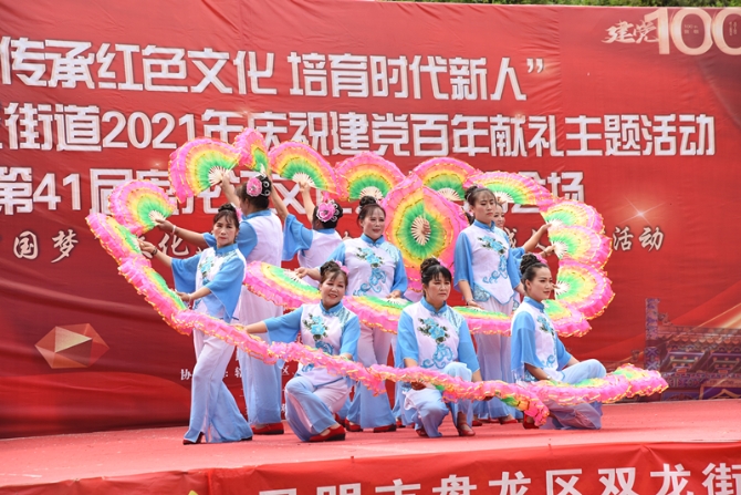 随后,大家来到红色教场观看由双龙街道辖区群众文艺队和昆明晚晴歌舞队带来的“唱响红歌”文艺演出。演出在歌伴舞《我爱你中国》中开场,配乐诗朗诵《囚歌》、男女声小合唱《我和我的祖国》、男声独唱《党亲爱的妈妈》、舞蹈《北京的金山上》等,无一不将各族儿女对中国共产党的热爱和深情完美地展现。