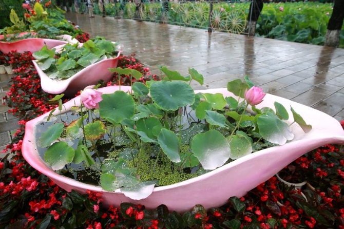 沿着公园主游路、近华浦区域步入公园,沿线的缸栽荷花也开得正好,叶色青翠欲滴,花开正好的荷花娇艳欲滴,荷香醉人。精心打造的“百年辉煌”、“荷色生香”、“荷花仙子”、“髯翁撰长联”等荷花主题园林小品,在时令花卉的映衬下,营造出百花争艳、盛世花好,喜迎建党百年华诞的喜庆氛围。亭亭玉立、含苞待放的荷花,在阳光雨露的沐浴下显得更加妩媚、可爱,给人无限遐想,吸引着八方来客驻足观赏。