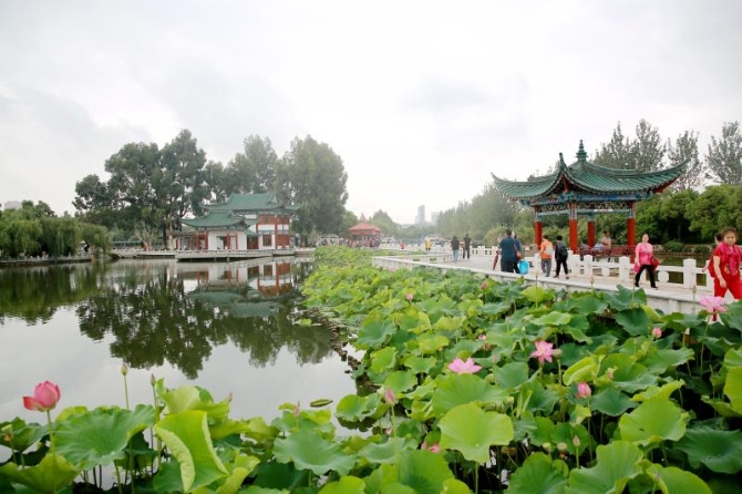 记者在大观公园看到,200余亩的水域中,满塘荷花叶色青翠、亭亭如盖。朵朵粉红色的荷花或蓓蕾初绽、欲吐芳菲,或花瓣舒展、激情绽放。“四面荷花三面柳,满湖碧叶一水楼”的夏日美景,让市民和游客陶醉其中,感受荷香水韵的美景。