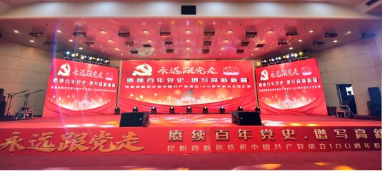 会场外,高新区的建区大事记、发展成就、人才荟萃、企业风采展示内容与中国共产党成立100周年庆祝活动标识相互辉映、格外醒目;国际会议厅灯光璀璨、气氛热烈,洋溢着浓浓的节日气氛,循着历史的年轮,追寻百年奋斗的闪亮足迹,向中国共产党的百年风华,致以昆明高新人最美好的祝福,最崇高的敬意!