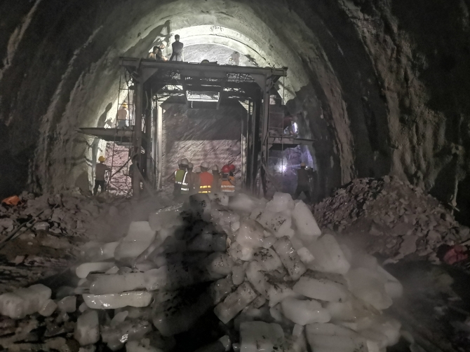 为改善作业环境,提升作业效率,有序推进建设,现场采用调整风机接力位置、增加射流风机数量,平均每天运送70吨冰块到进出口施工点物理降温等措施,大幅度的降温、降尘、增氧,有效改善了洞内作业环境,确保了隧道有序建设。