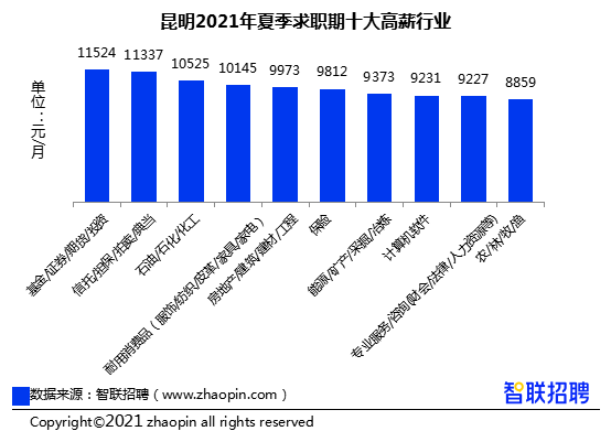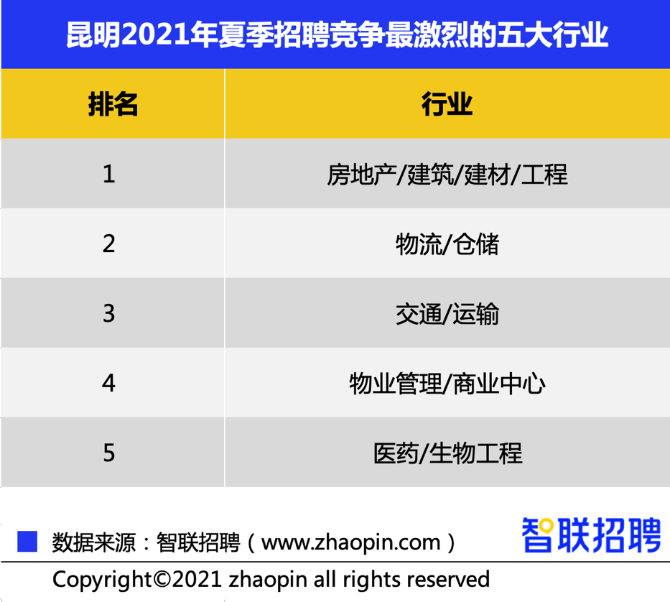 智联招聘近日发布《2021年夏季昆明雇主需求与白领人才供给报告》,其中指出,本季度昆明地区就业市场竞争指数在全国核心城市中排名第20位,求职期的平均薪酬为8375元/月,排在第21位,房地产/建筑/建材/工程行业的竞争指数最高,交通运输服务是竞争最激烈的职业。