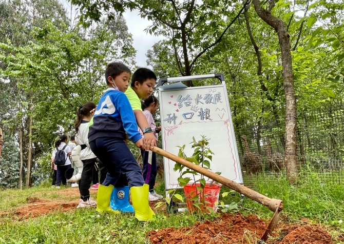大家做得有模有样,小朋友一边挖坑,一边说:“我喜欢长颈鹿,给他们种棵桑树,让它们吃得更好些。”家长杨代兵说,带着小朋友一起种树,感觉很有意义,大家一起以实际行动参与生态环境保护,进一步增强做好生物多样性保护的责任感和使命感。随后,为了让孩子们对此次活动有更进一步了解,工作人员还带领孩子们一起看了长颈鹿和象龟,并给它们喂食,现场欢笑声不断。