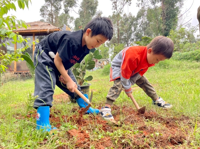 种植开始前,园区科普教育部的老师介绍了动物趣味小知识。听完介绍后,通过指导,小朋友们分组领好铁锹和树苗,热火朝天地就开始动手了。大家先用铲子、锄头挖了一个个又大又深的坑。然后,小心翼翼地把小树苗移入树坑扶住,最后提着水桶给树苗浇水,空地上不一会儿功夫多了几十株树苗。