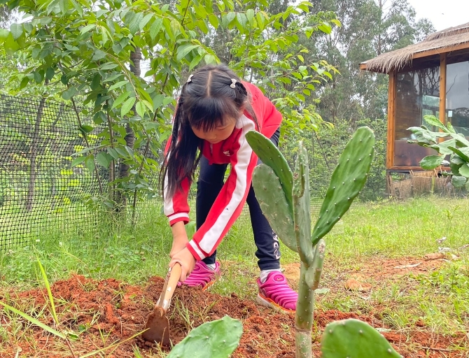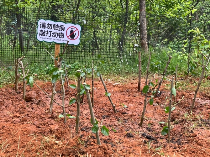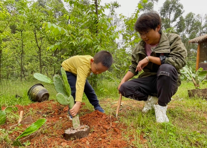 树木不仅能净化空气、调节气候,树木的根茎、枝叶也是有些动物最重要的“口粮”。不同的动物根据不同的生活习性,喜欢的“口粮”也不同。此次活动,园区通过前期招募,专门组织孩子和家长分别为长劲鹿和象龟种植桑树和仙人掌。据介绍,桑叶是长颈鹿最爱吃的一种树叶,而象龟最喜欢吃多汁的绿色仙人掌。在昆明,又因6月雨水较充沛,树苗种植后成活率高,所以一般选择在此时间段内种树。