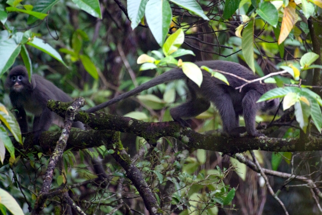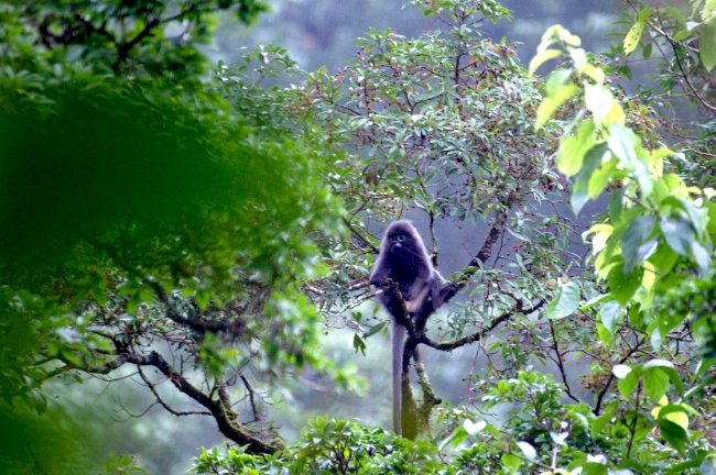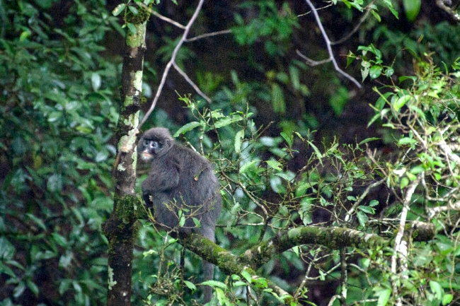 “今天天气好,应该能看到猴群。”在当地护林员的带领下,记者团进入保护地不久,便在一处山涧对面见到了外出觅食的菲氏叶猴群。它们在树冠上自由穿梭,时而翻找果实咀嚼叶片,时而三三两聚在一起相互“交流”,也有“好奇宝宝”爬到较为开阔的树枝上观察山涧对面拿着“长枪短炮”的记者们。