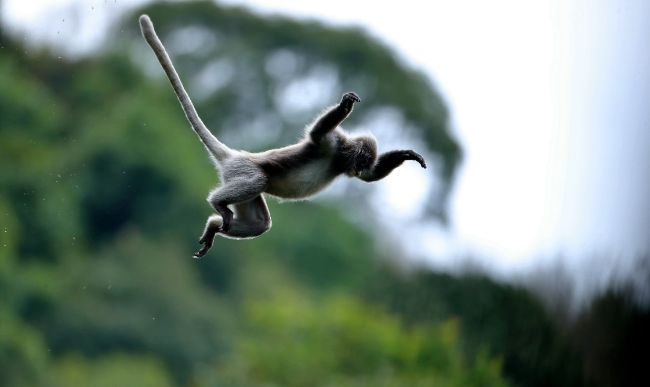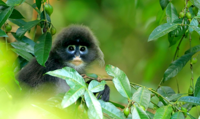 菲氏叶猴身披极具高级感的青灰色毛,拖着长长的尾巴,这也是它们的显著特征之一,长尾巴就是它们完成丛林穿越重要的“平衡器”。它们还有深邃的圆眼,与众多猴科亲戚相比,算是长了一张“娃娃脸”。它们眼周、口鼻部因为缺少色素而呈现浅色,与全身的青灰色反差非常大,极具辨识度。
