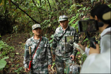 带领记者团进入保护区的护林员们腰间都佩戴着独具民族特色的长刀——户撒刀,他们是芒市轩岗乡井村的护林员。护林员黄七邦告诉记者,2016年之前他一直以伐木为生,在当地政府引导下,逐渐成为一名护林员。从此,他也与菲氏叶猴结下了不解之缘。