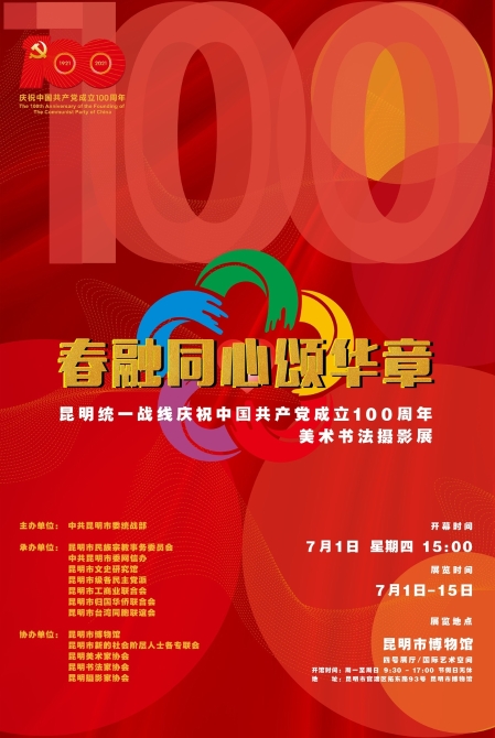 百年征程波澜壮阔,百年奋斗日月同辉。为庆祝中国共产党成立100周年,深入学习贯彻习近平新时代中国特色社会主义思想,深刻总结党领导统一战线的光辉历史,展示统一战线广大成员听党话、跟党走、感党恩的精神风貌,7月1日起至15日,“春融同心颂华章”——昆明统一战线庆祝中国共产党成立100周年美术书法摄影展在昆明市博物馆4号展厅和国际艺术空间隆重举办。