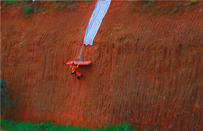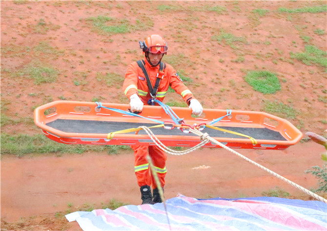现场不是实战胜似实战,指挥员不时用对讲机呼喊,随时掌握情况。救援人员携带所需装备通过系统下降到悬崖底部,针对事故给受困人员心理造成的强烈冲击,发现“伤员”后先是对受困人员进行心理疏导,为确保不造成二次伤害,救援人员在认真包扎后,将“伤员”牢牢固定在担架上,然后利用担架进行陪伴护送吊升。经过近10分钟的紧张救援,“伤者”终于成功“获救”。