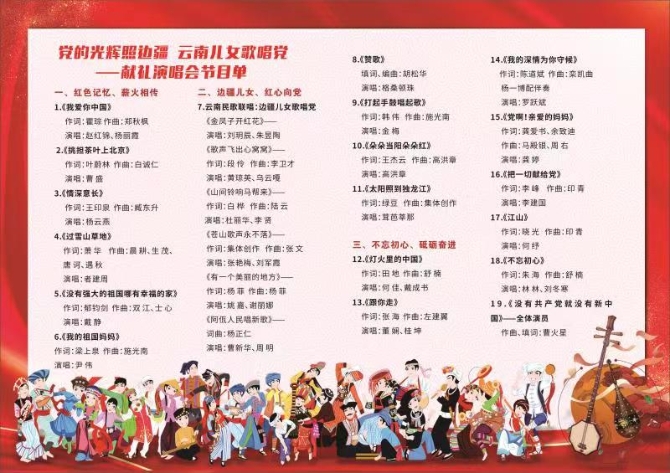“金凤子(那么)开红花 一开开在穷人家,穷人家要翻身,世道才像话,今天盼(那么)明天盼 盼着老天出太阳,太阳一出照四方,大家喜洋洋。”第二篇章“边疆儿女·红心向党”以云南民歌联唱《金凤子开红花》开篇,用歌声表达了云南各族人民永远听党话、跟党走、感党恩的思想自觉和行动自觉。