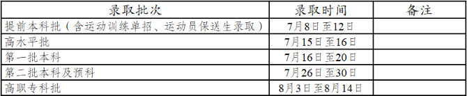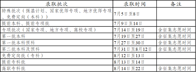 其中,7月5日至8日为特殊批次录取;7月9日至14日为提前本科、提前专项批录取;专项批次录取时间为7月14日至19日;第一批本科录取时间为7月19日至27日;第二批本科及预科录取时间为7月31日至8月12日。