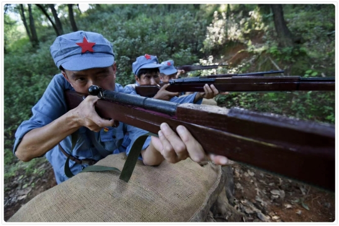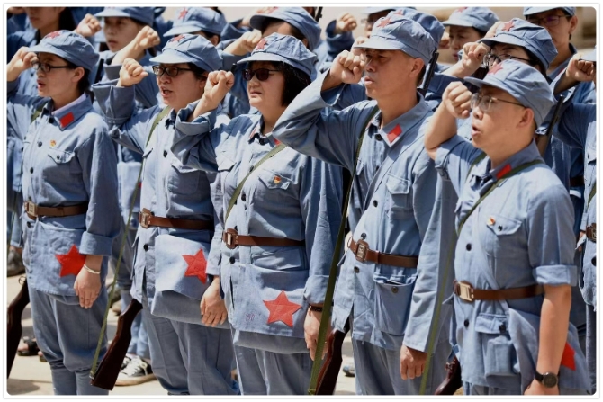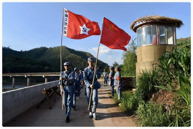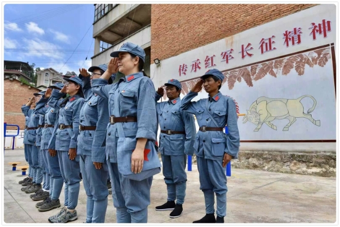 下午2点,首批参加体验教育活动的学员,身穿红军军装在清河村委会小广场集合。哨声吹响,他们听从号令,迅速整齐列队,在“红军政治教员”的带领下,党员重温入党誓词、中国工农红军誓词。炎炎烈日下,铮铮誓言在山村上空回荡,仿佛瞬间回到了那个艰苦奋斗的年代。