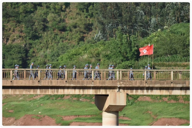随后,“红军军事教员”带领学员进行了队列、军姿训练等“红军训练”,并向着约7公里长的“红军长征路”体验环线出发,途经红军桥,并在红军烈士墓前祭奠红军长征过富民时牺牲的战士们。